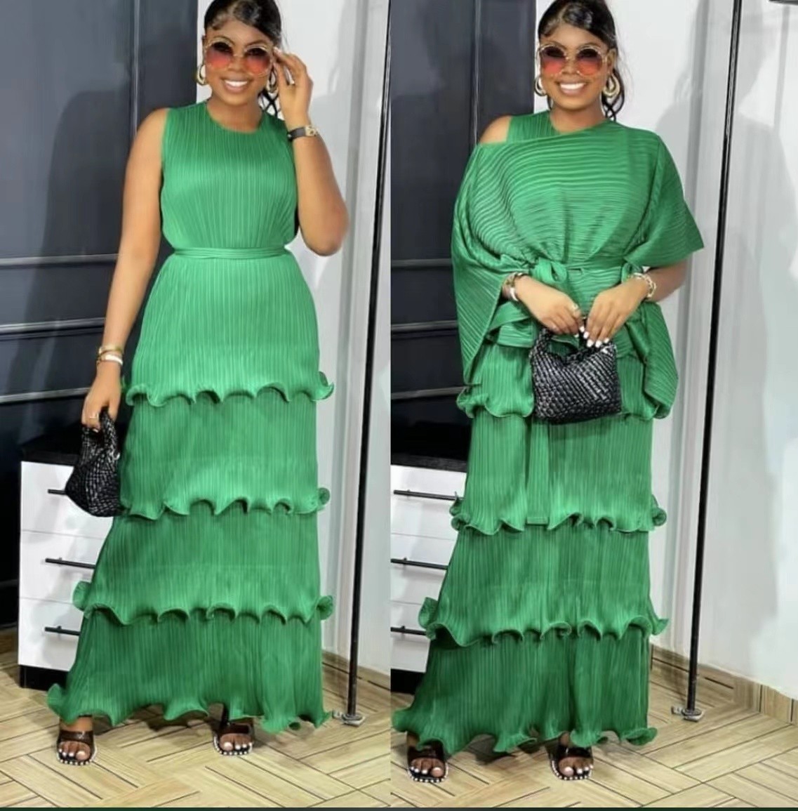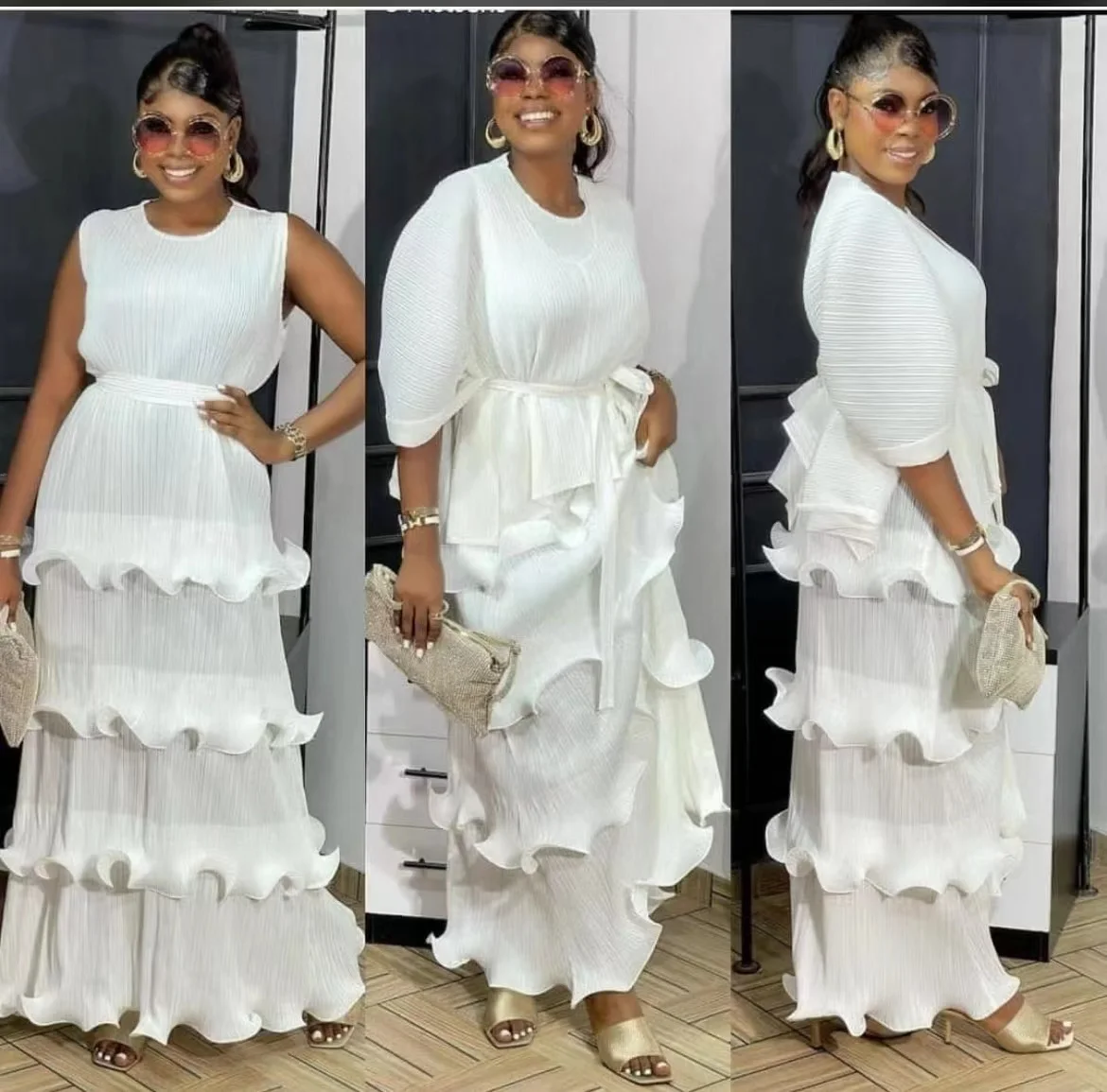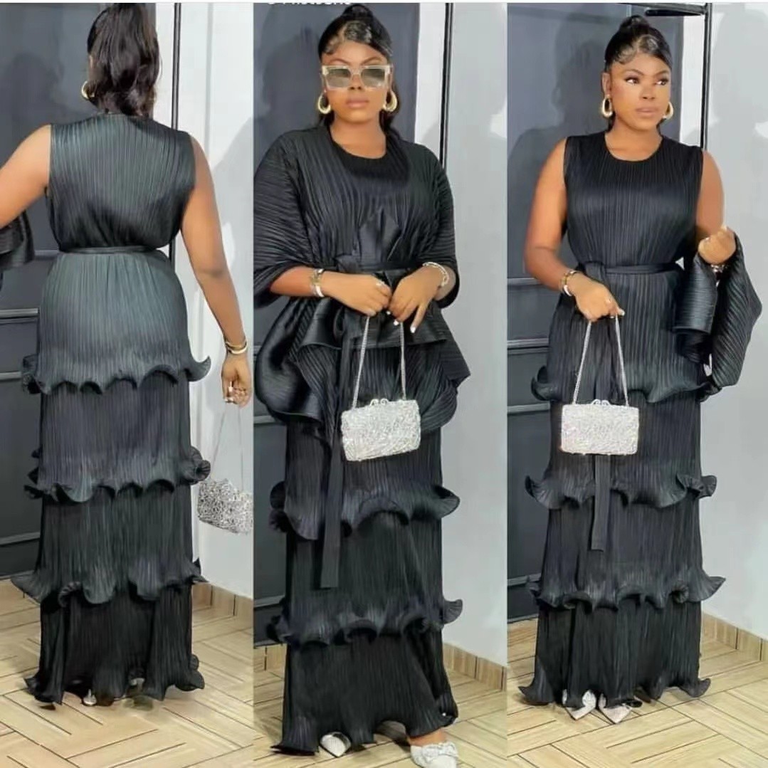 2-Piece Set for Women O-neck Solid Color ShortSleeve Pleats Belt Bodycon Casual Fashion Ruffle Elegant Women Dress