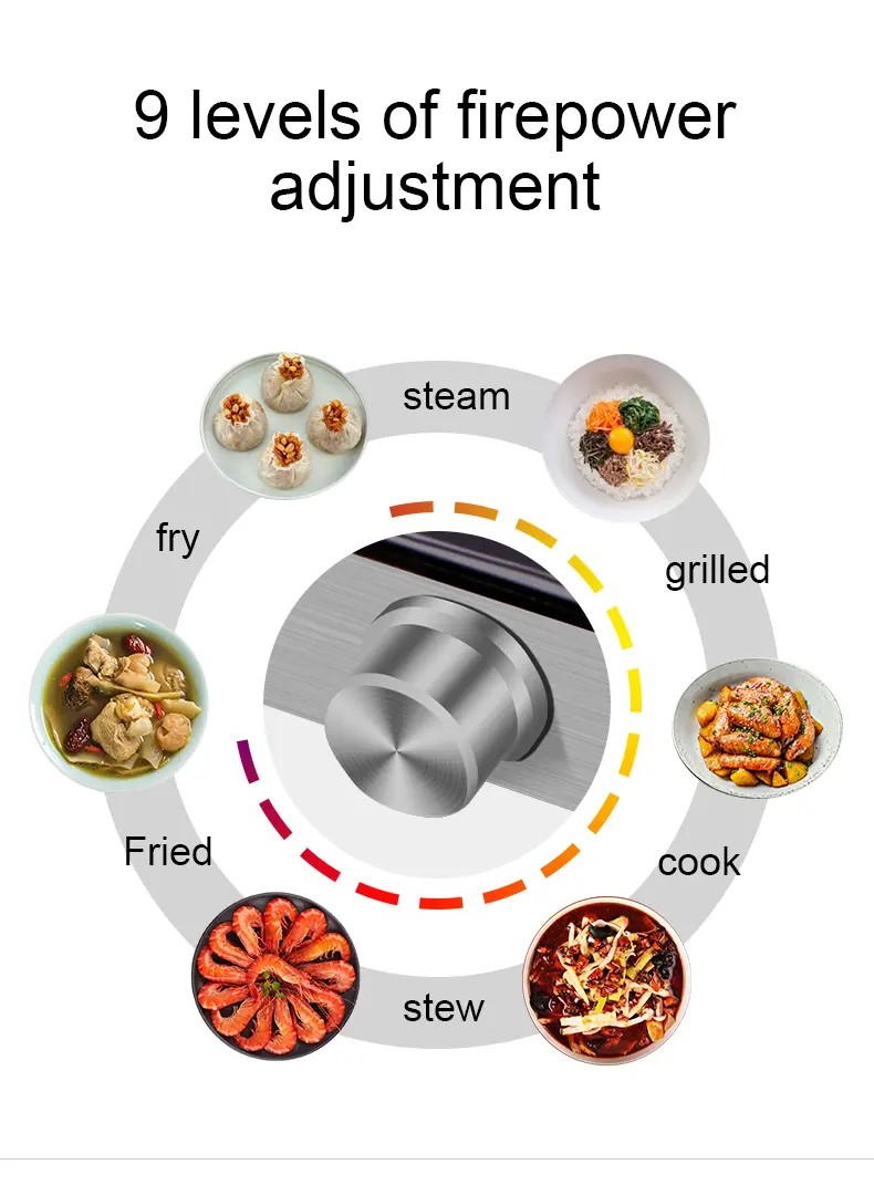 Soup Stewing, Hotpot, Steam & Boil, Porridge Cooking, Milk Stewing, Water Boiling, Fry, Temperature Adjustment, Mild Fire Stewing, Intense Fire