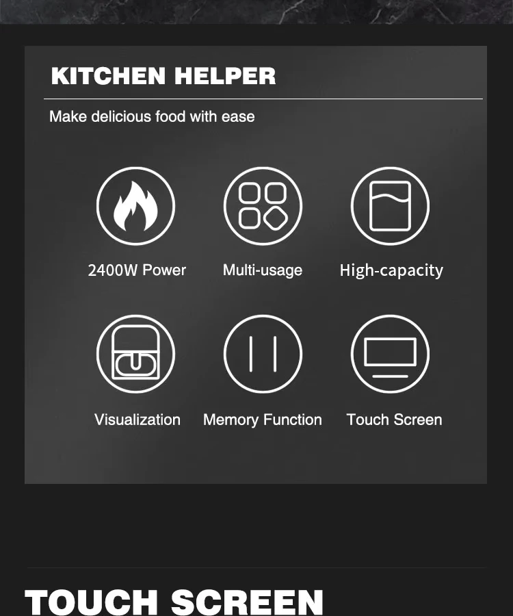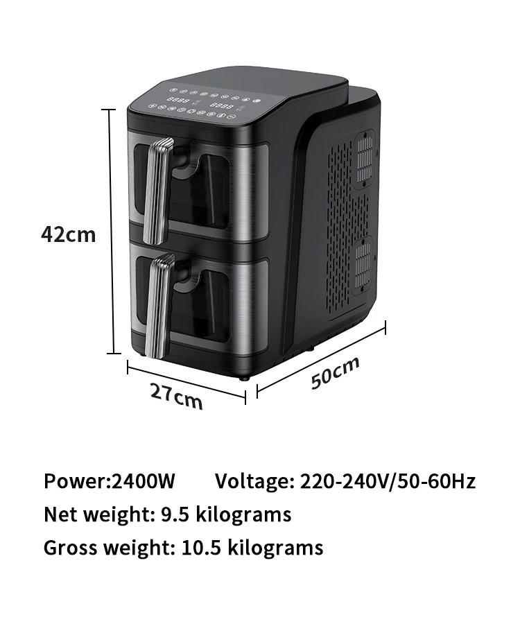 This 2025 New Design Smart Digital Air Fryer features a modern square style with dual-layer technology for space-saving and energy-efficient household cooking. It offers a 10L capacity, touch screen control, and multiple functions including air frying, roasting, baking, grilling, and dehydrating all in one device. Designed for versatility, it suits household, commercial, outdoor, RV, and hotel use. The product ensures easy operation and oil-free cooking, making it a healthy choice.