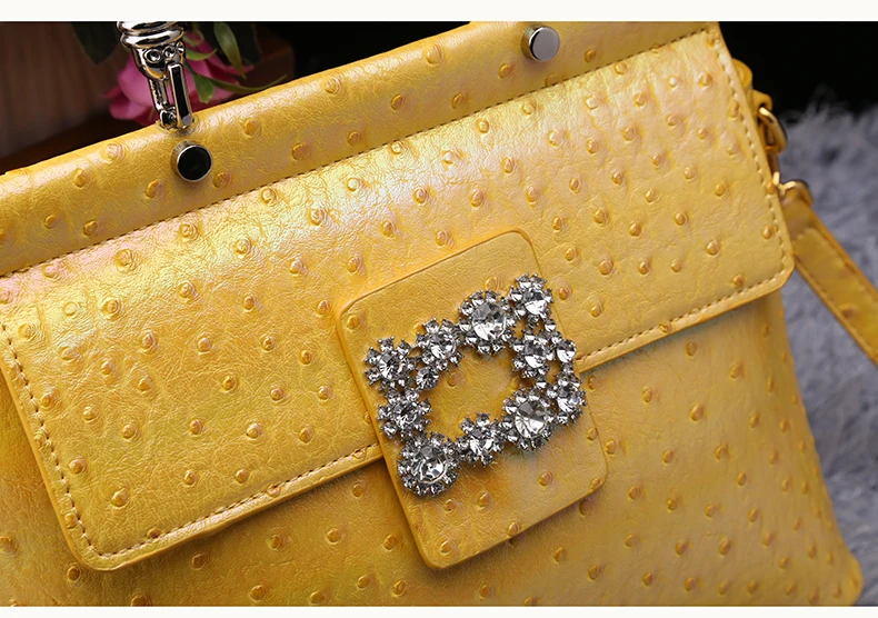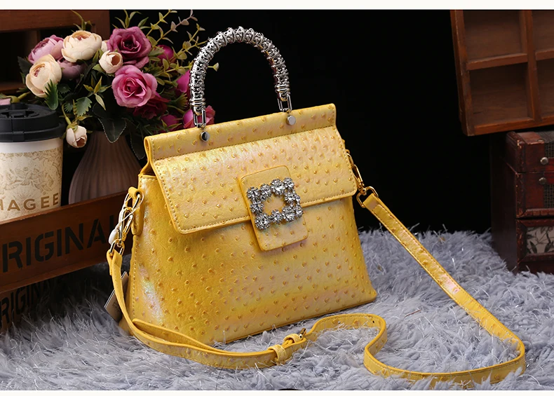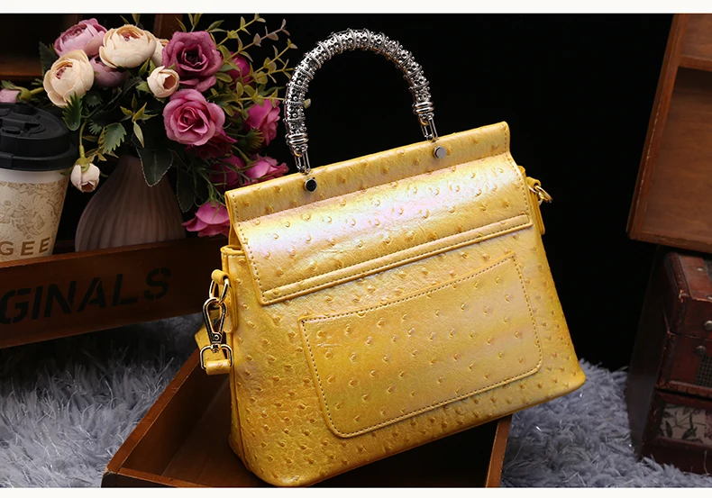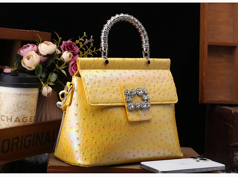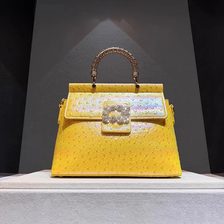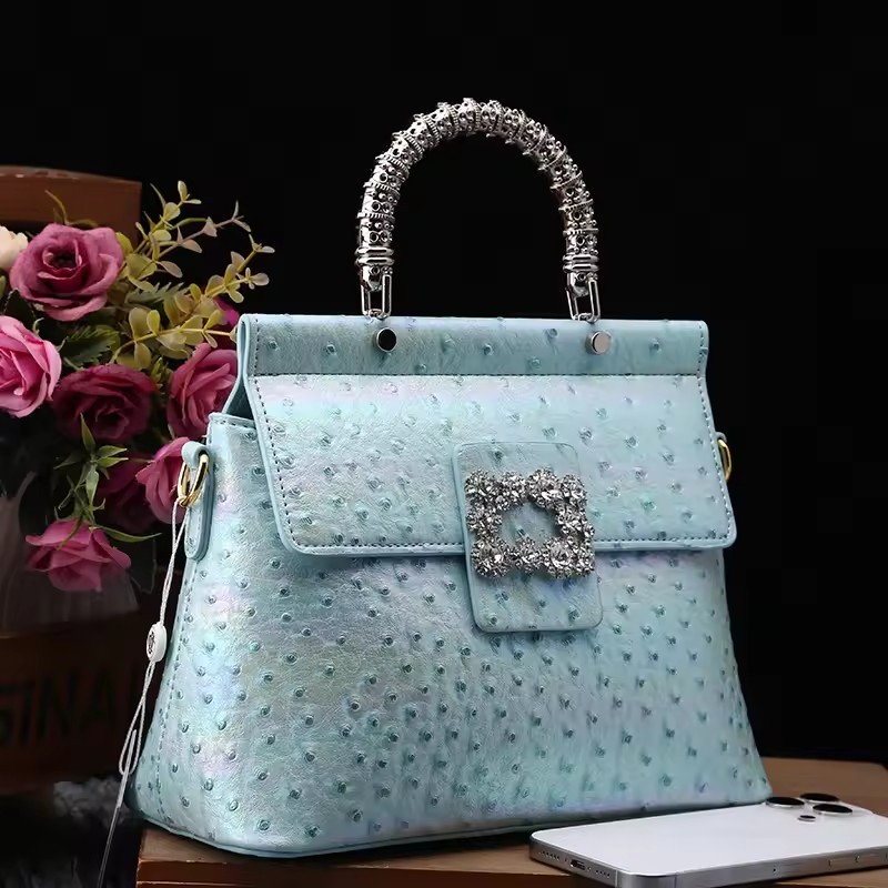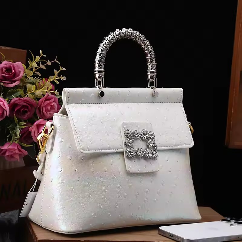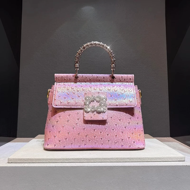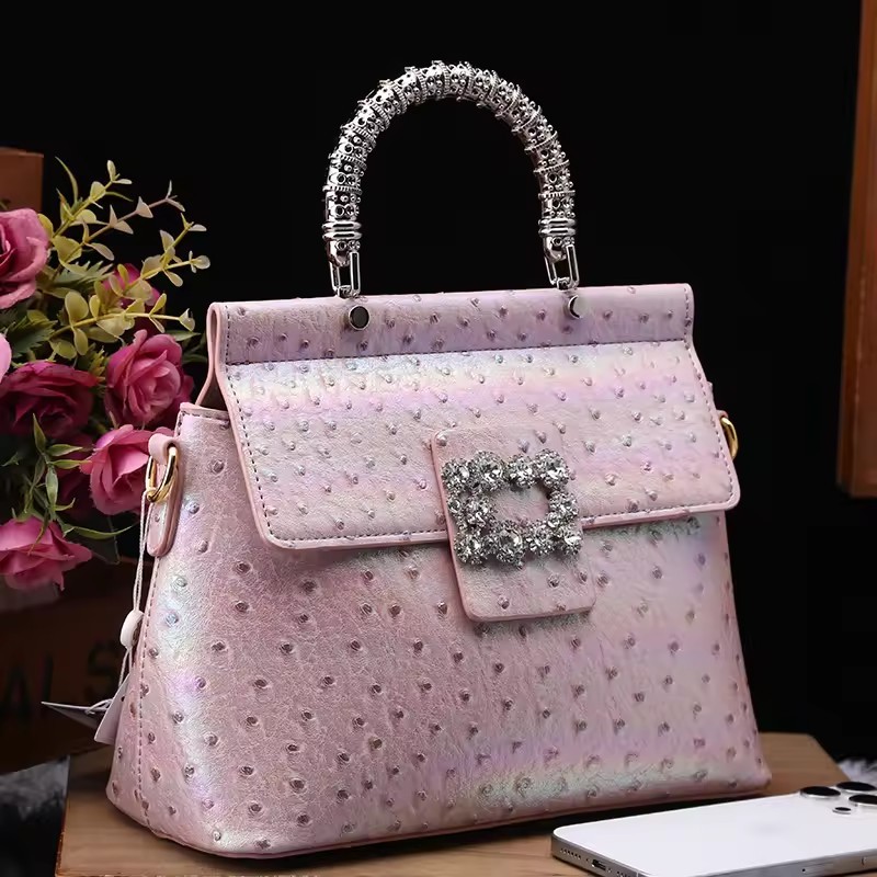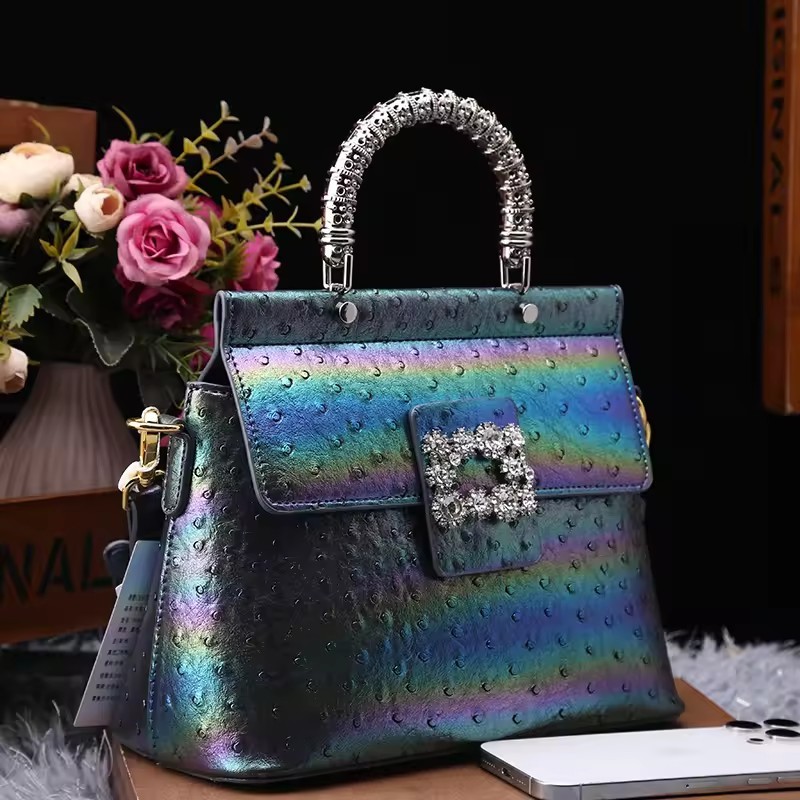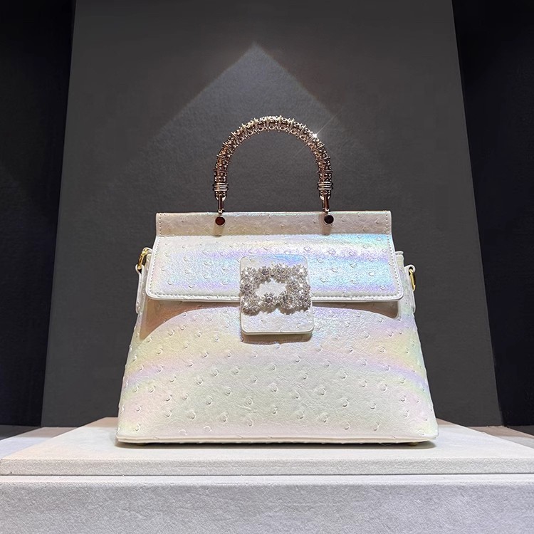Genuine leather handbag with diamond-encrusted handles, designed for fashion brands targeting premium women's accessories. Features iridescent leather texture and structured pillow shape for everyday elegance and brand differentiation. Customizable in color, logo, and size with OEM/ODM support for boutique or gifting markets. MOQ 2 pcs | Sample in 1–10 days | Supplier provides BSCI audit documentation.