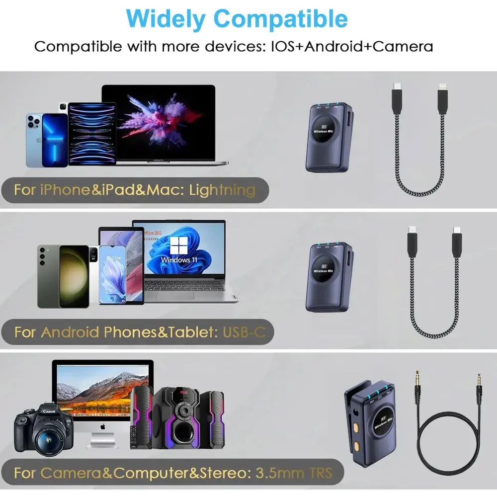 This 2Mic Wireless Microphone is designed for versatility, compatible with smartphones, digital cameras, and more. It features a lightweight and portable design, a 20-meter wireless range, and up to 40 hours of working time. The omnidirectional condenser microphone offers noise cancellation and a frequency response of 20Hz-20KHz, ideal for vlogging, interviews, live streaming, and teaching.