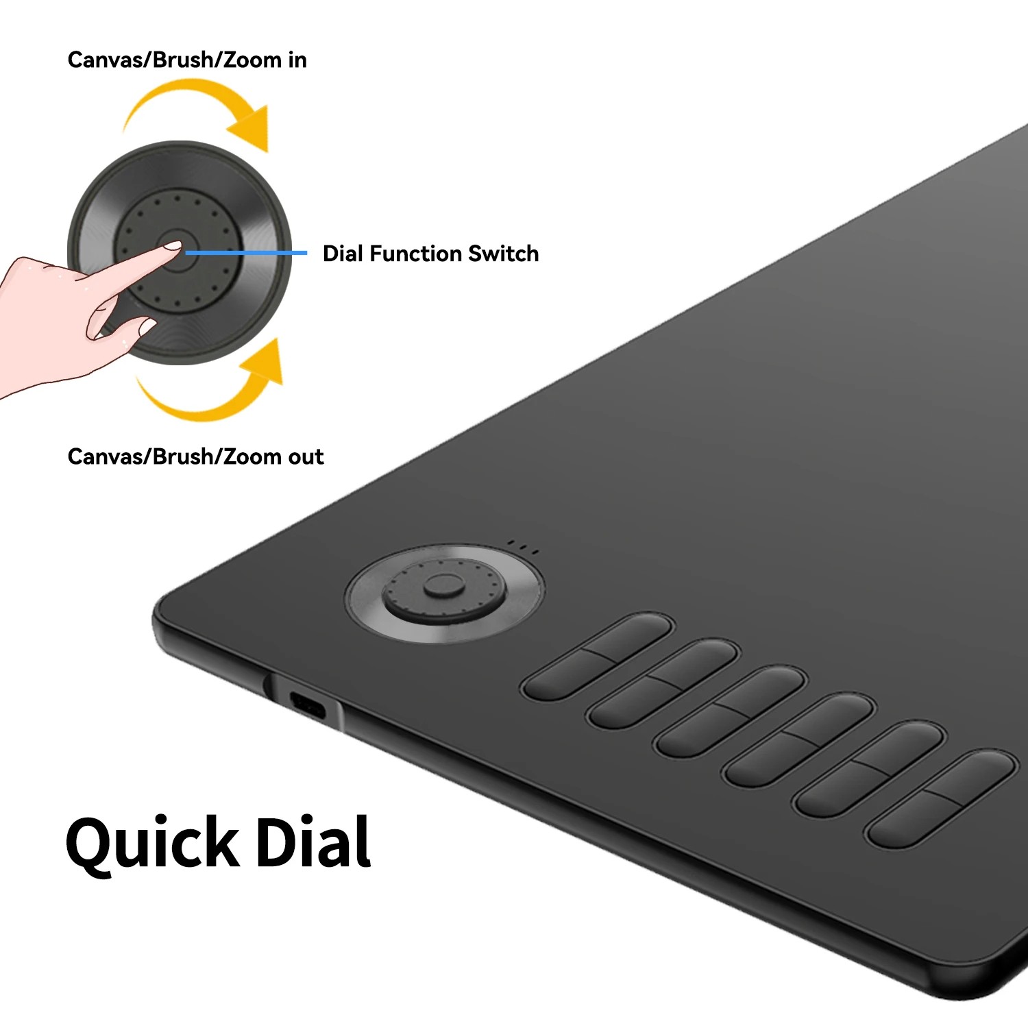 * 12 Customized Shortcut keys for convenience and efficiency, save your time to draw and edit. * Function Dial: Switch between 3 functions: Brush zoom in/out ; Canvas zoom in/out; Mouse wheel up/down.