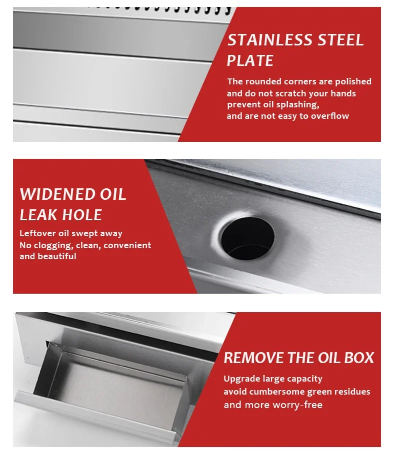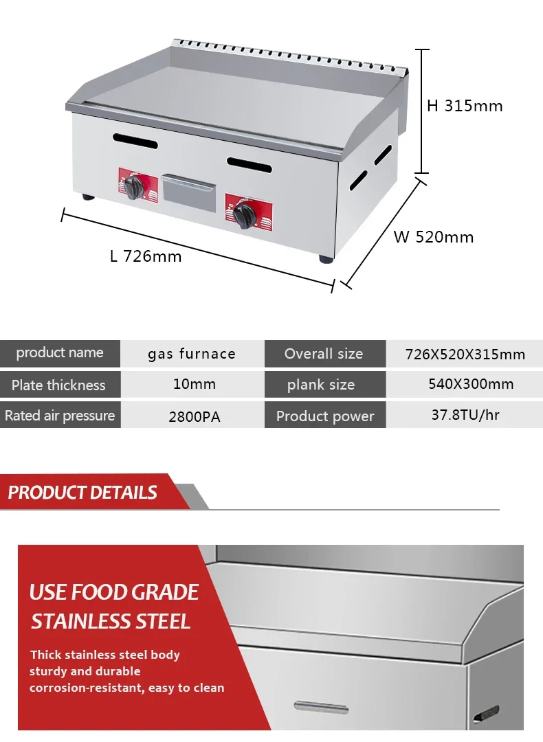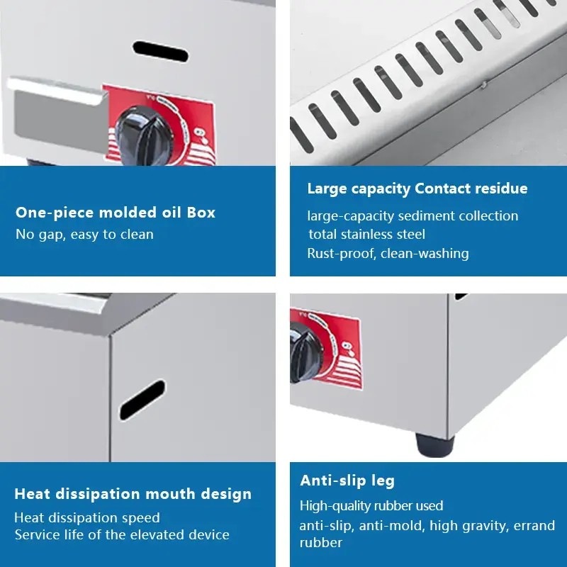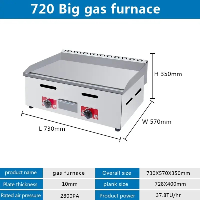 This commercial stainless steel gas griddle grill is designed for high-efficiency cooking in restaurants and catering services. Made from 201 stainless steel, it ensures durability and easy operation. With steam gas heating, it provides precise temperature control for various food types, making it ideal for busy kitchens.
