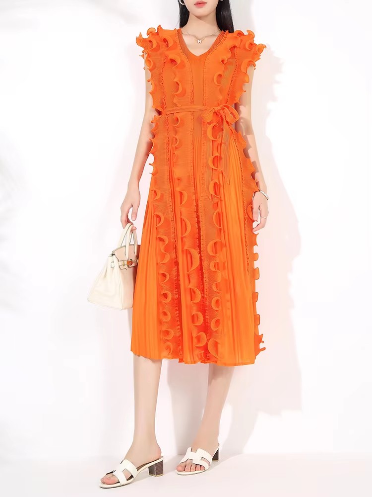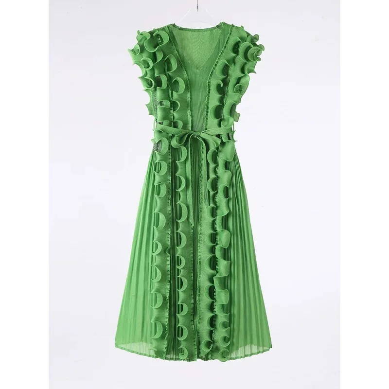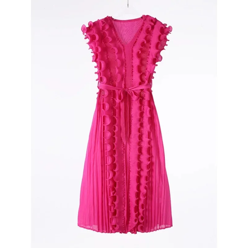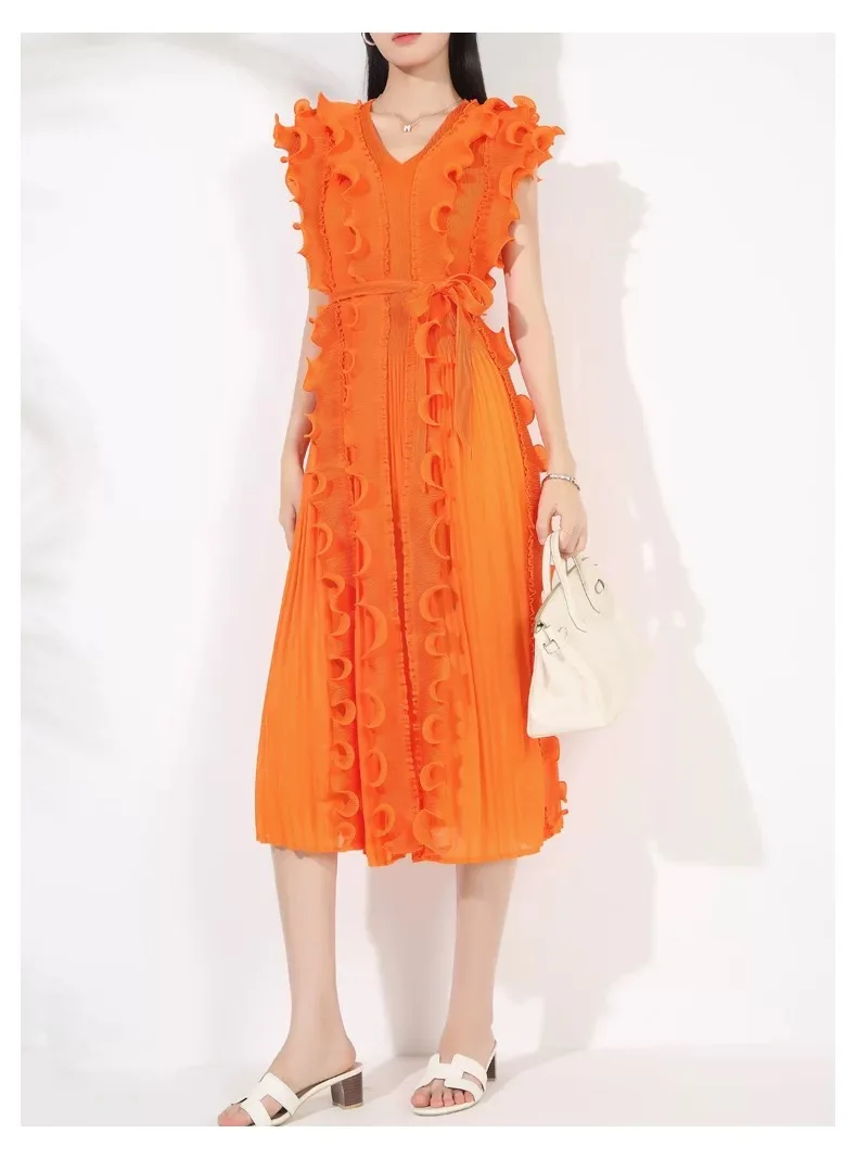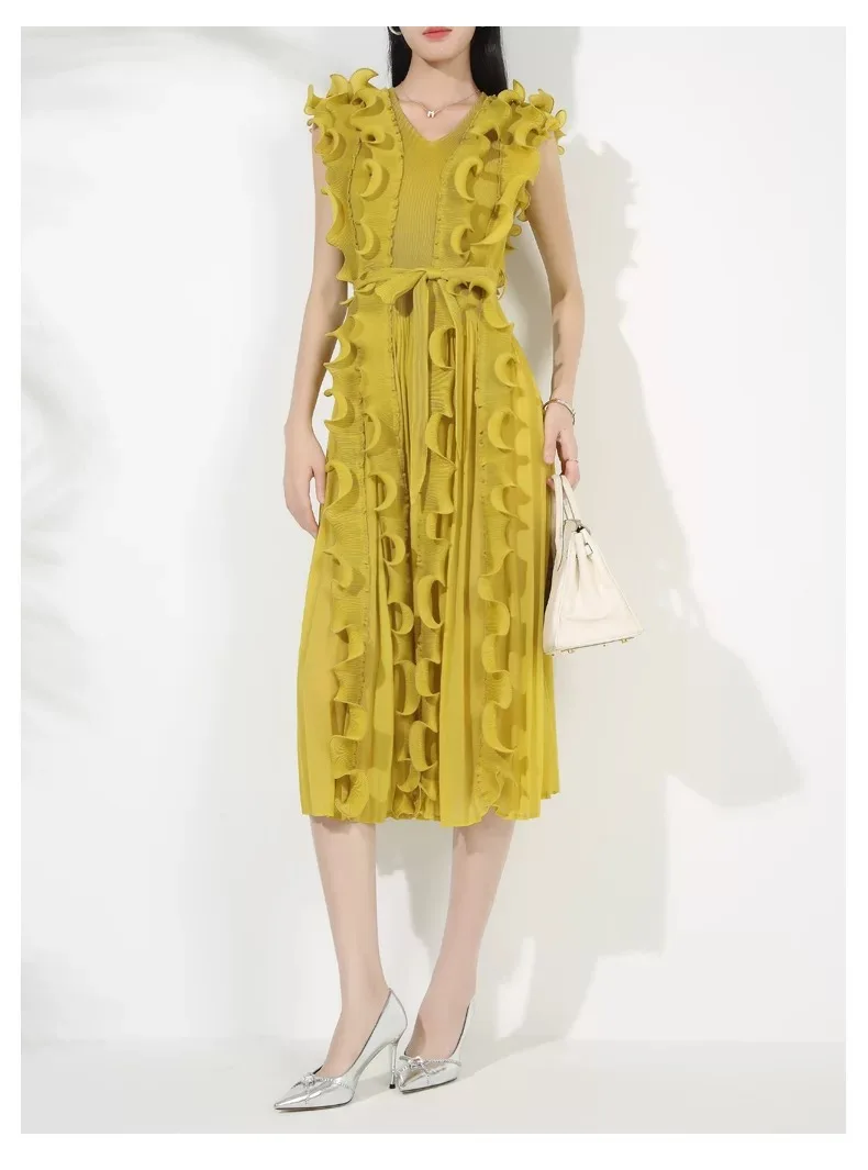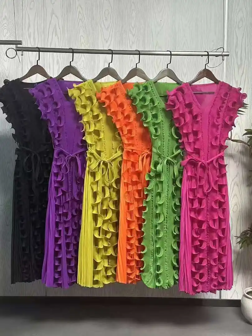 Casual African Solid Color High Quality V-Neck Ruffle Sleeveless Issey Miyake Pleated Plus Size Women Knee Length Dress