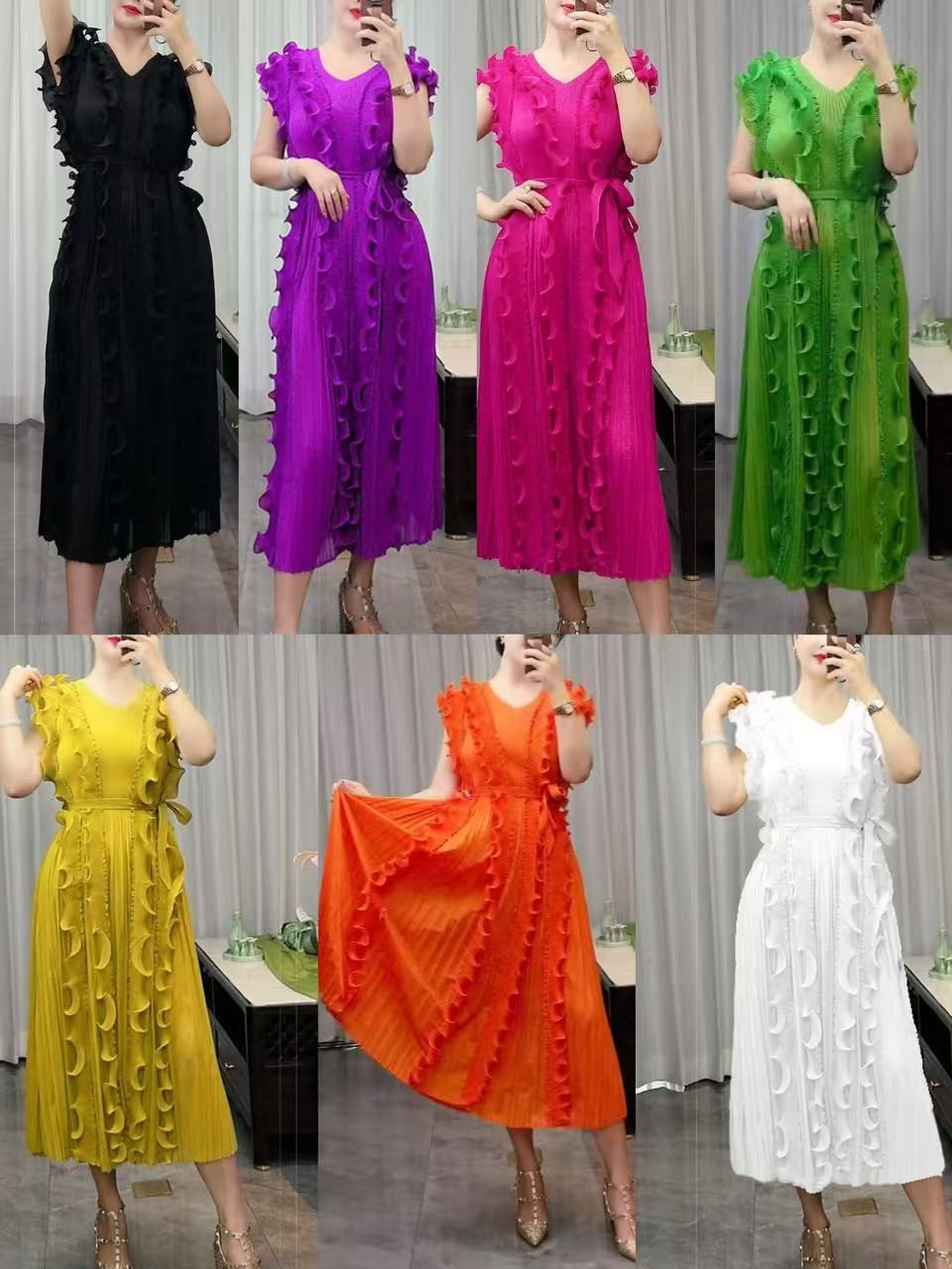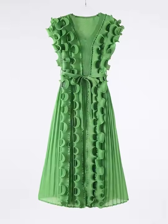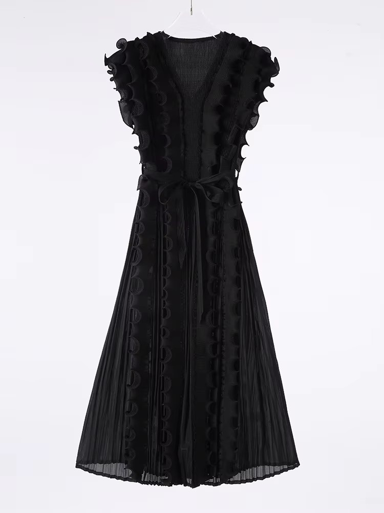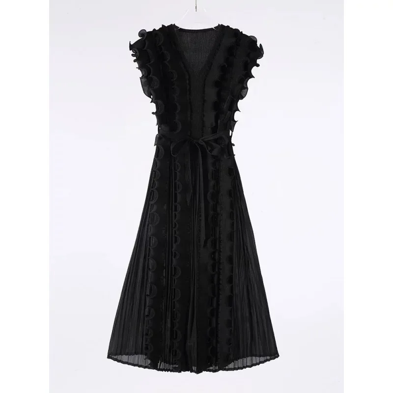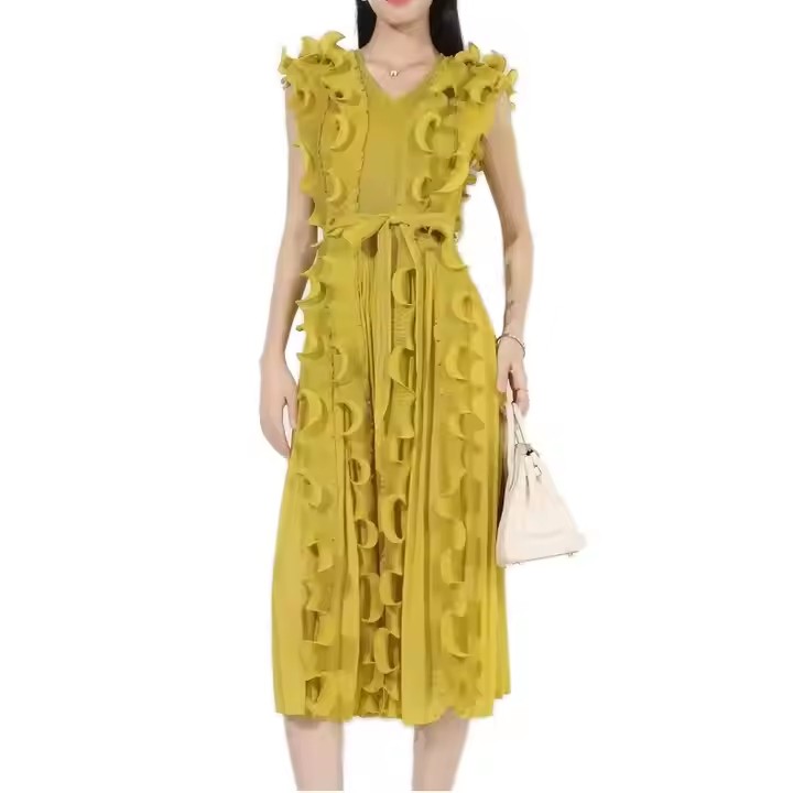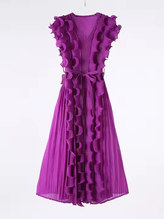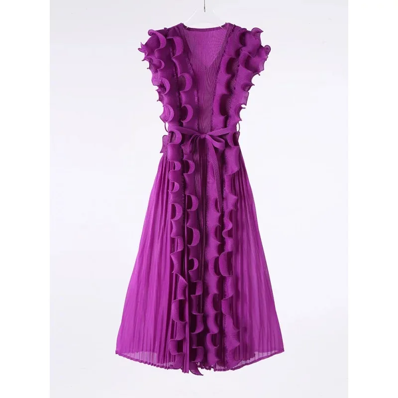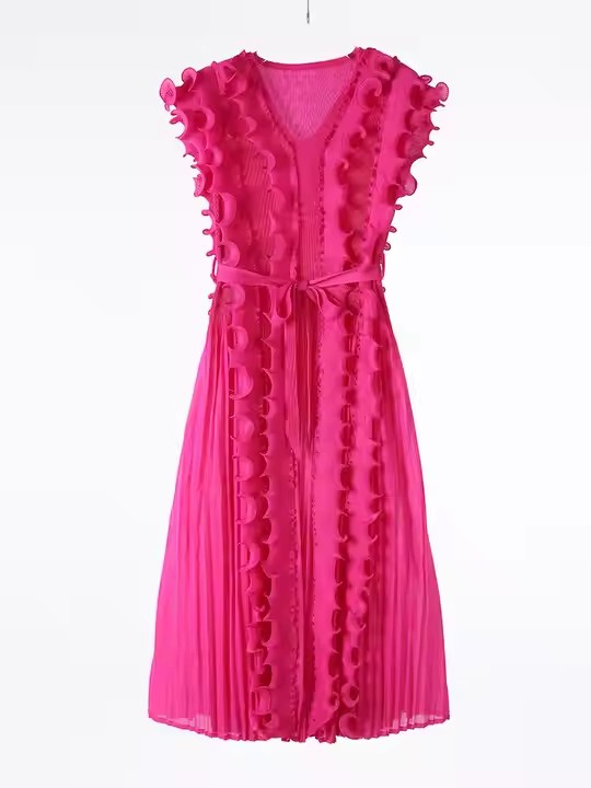 Casual African Solid Color High Quality V-Neck Ruffle Sleeveless Issey Miyake Pleated Plus Size Women Knee Length Dress