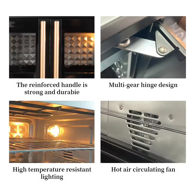 This 100L large capacity electric convection oven features a stainless steel heating element, 60-minute timer with bell ring, and a temperature range of 70-230℃. It is designed for versatile kitchen cooking and baking with a double glass door for easy monitoring. The oven offers multi-functionality, easy cleaning, and a durable metal housing, ensuring convenience and reliability for household and commercial use.