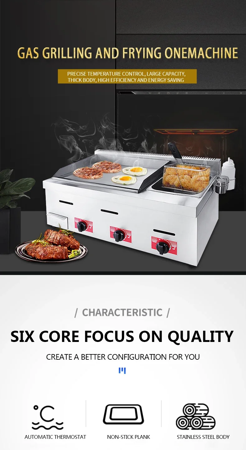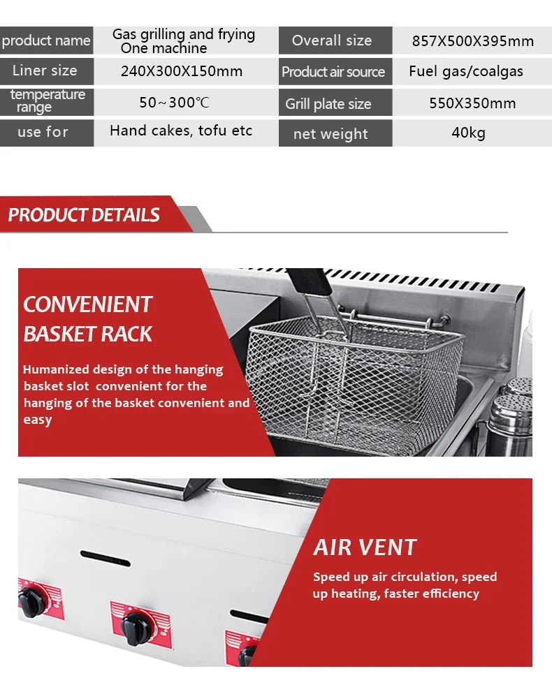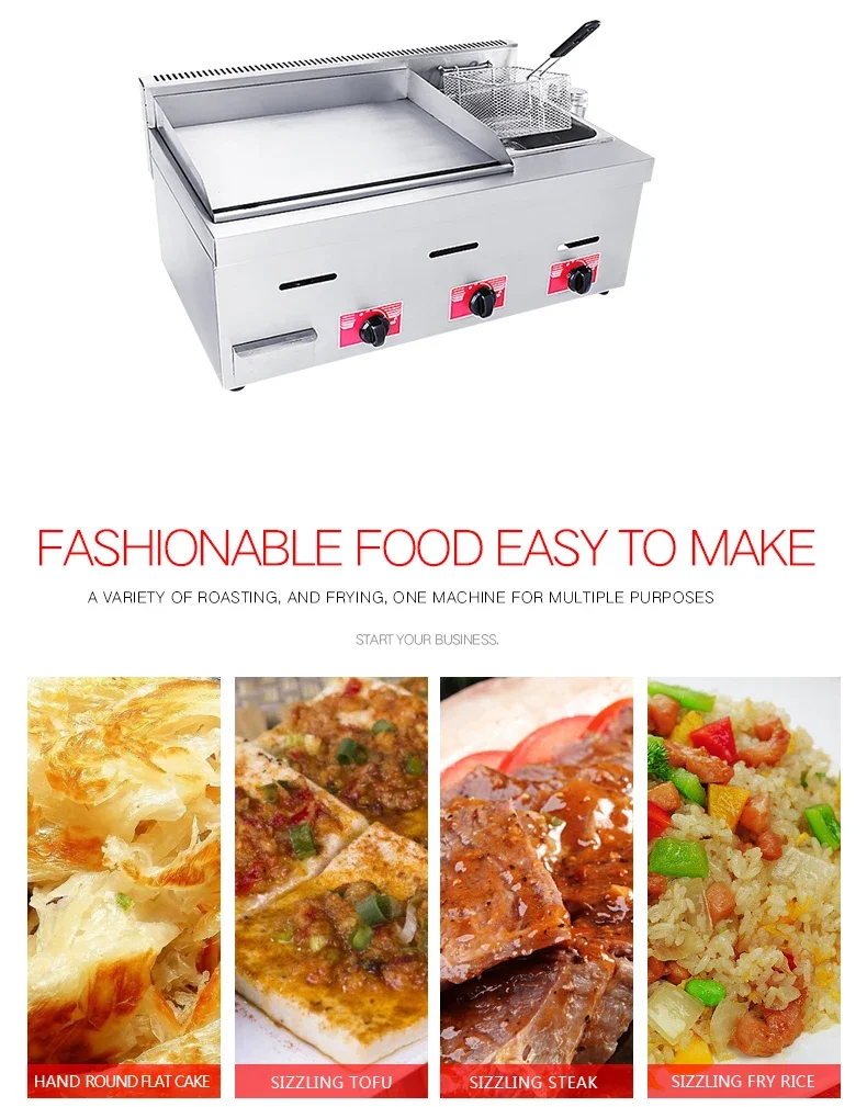 All-in-one powerhouse: Combines gas steamer, fryer, and iron plate grilling in a single, compact unit for versatile menu options: fried rice, grilled cold noodles, fried items, and steamed dishes.