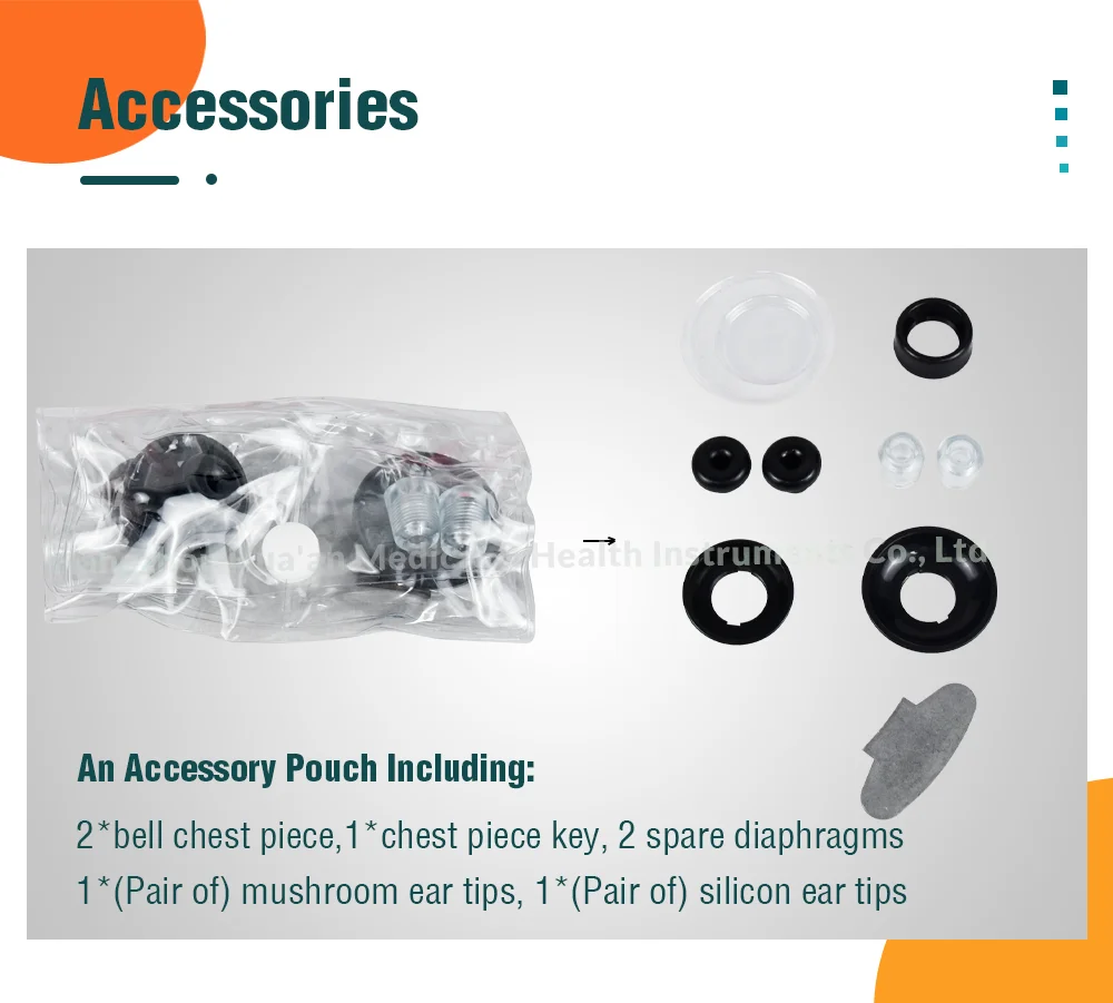 1. Auscultation surfaces are made of high quality PVC anti cold laps 2. Ear hanging group adopts adjustable design 3. Sound guide tube is provided with a built-in shrapnel hiding, and the tone guide tube cavity increased Y type installation set sound button 4. Earplugs with imported high elastic PVC synthetic material which can fit the ear more easily.