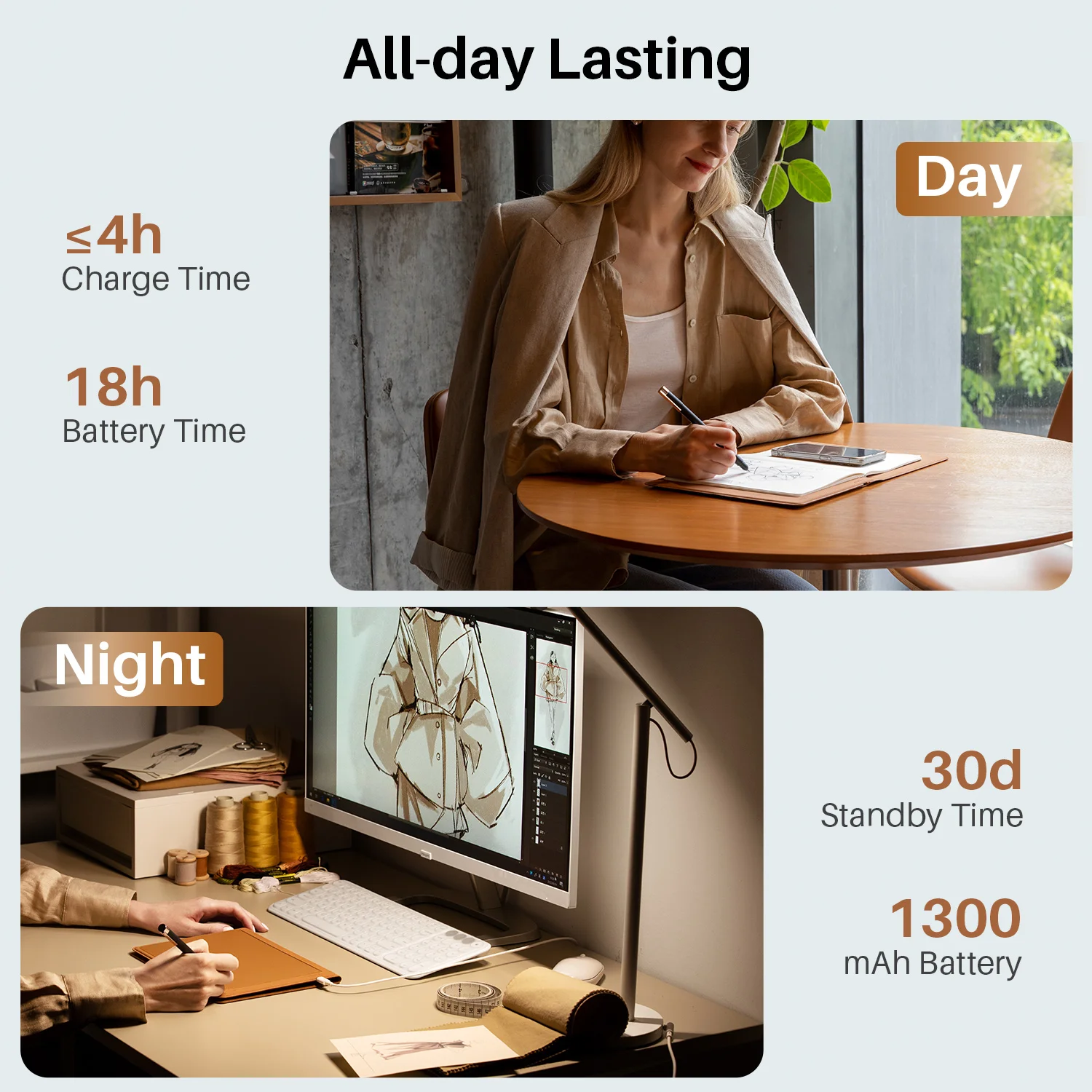 Huion Note hardware owns a long-lasting,the battery life can last 18 hours of using when fully charged.