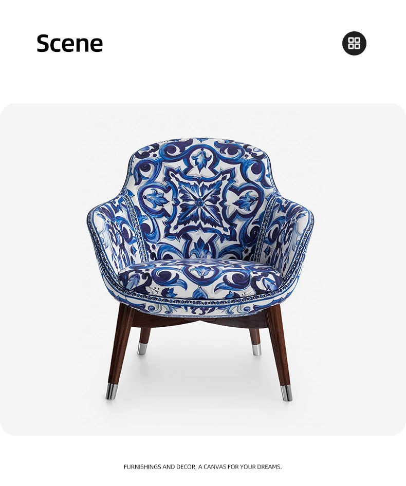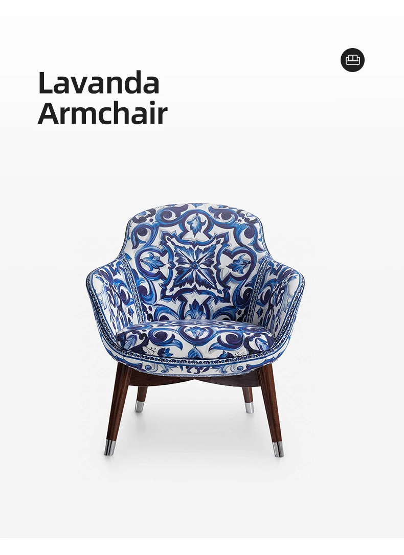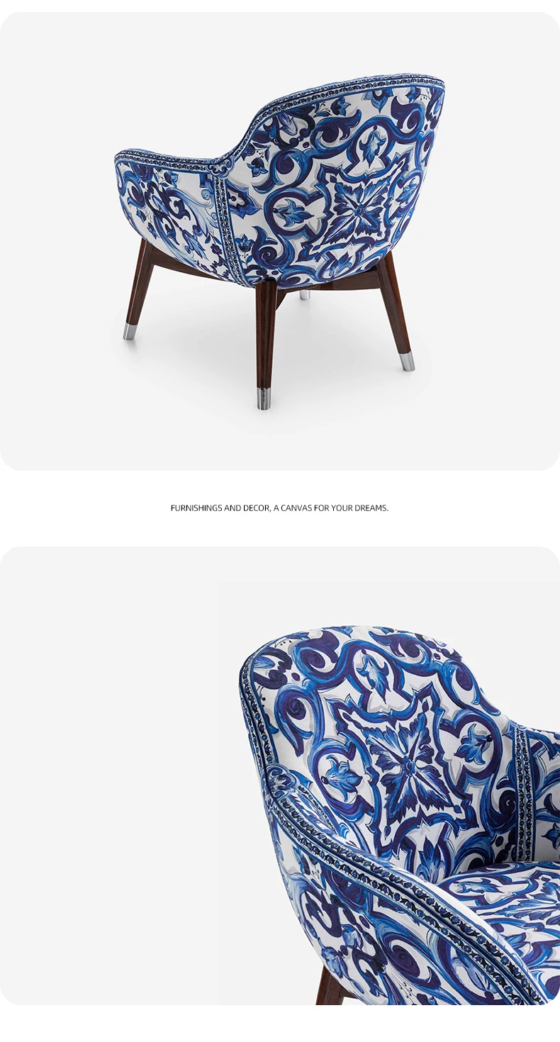 Italian Luxury Brand Handmade Minimalist Design Leisure Chair Blue Flower Fabric Upholstered for Home, Office, apartment, Italian Bedroom