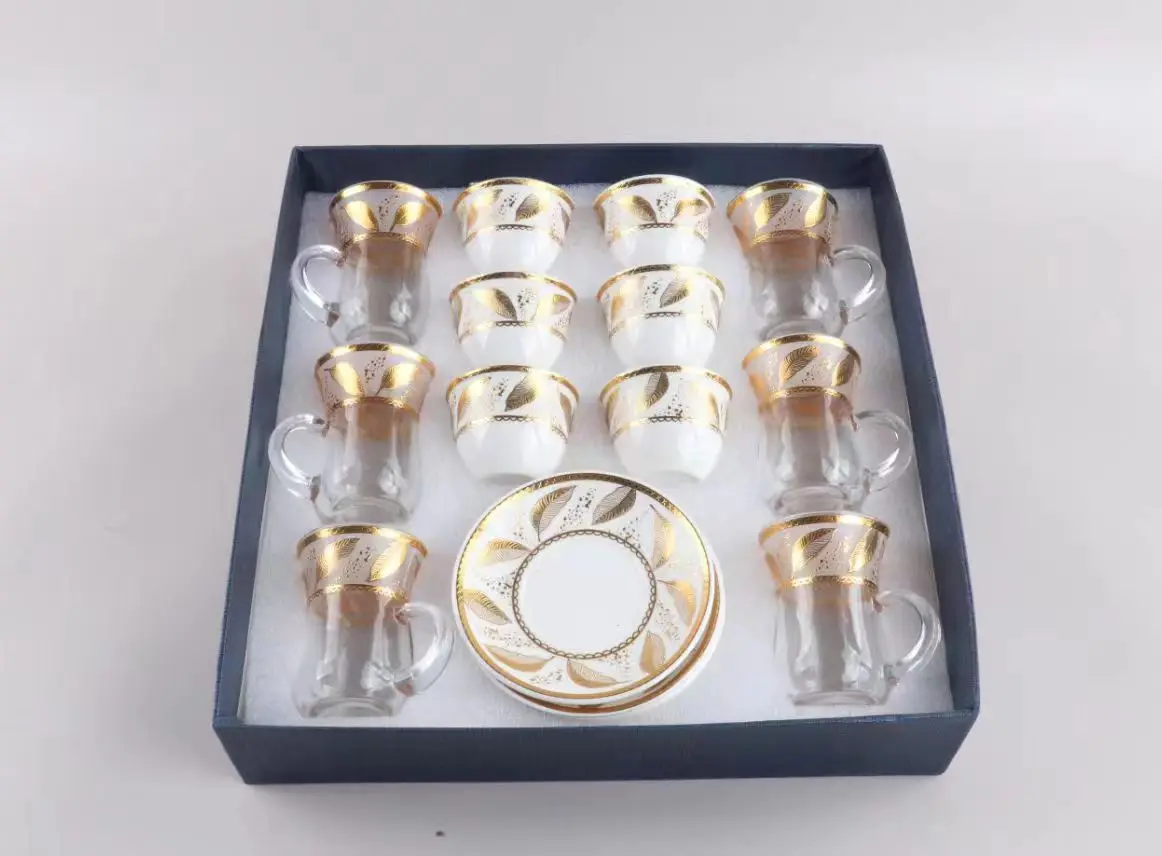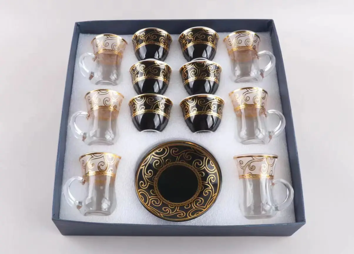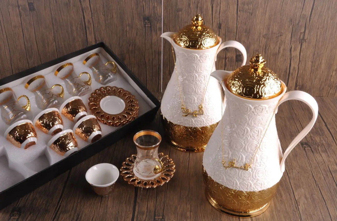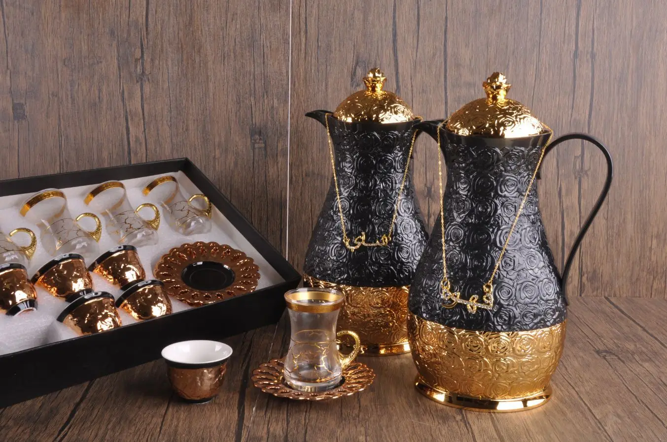 Royal Black Gold Arabian Glass Liner Carefe Porcelain Cawa Cup 1L Tea Coffee Kettle Set Dallah Pot Arabic Coffee