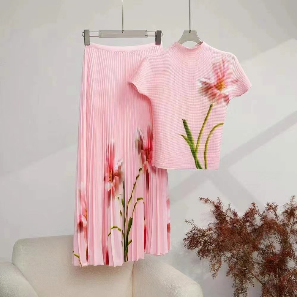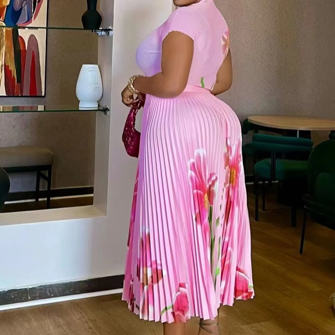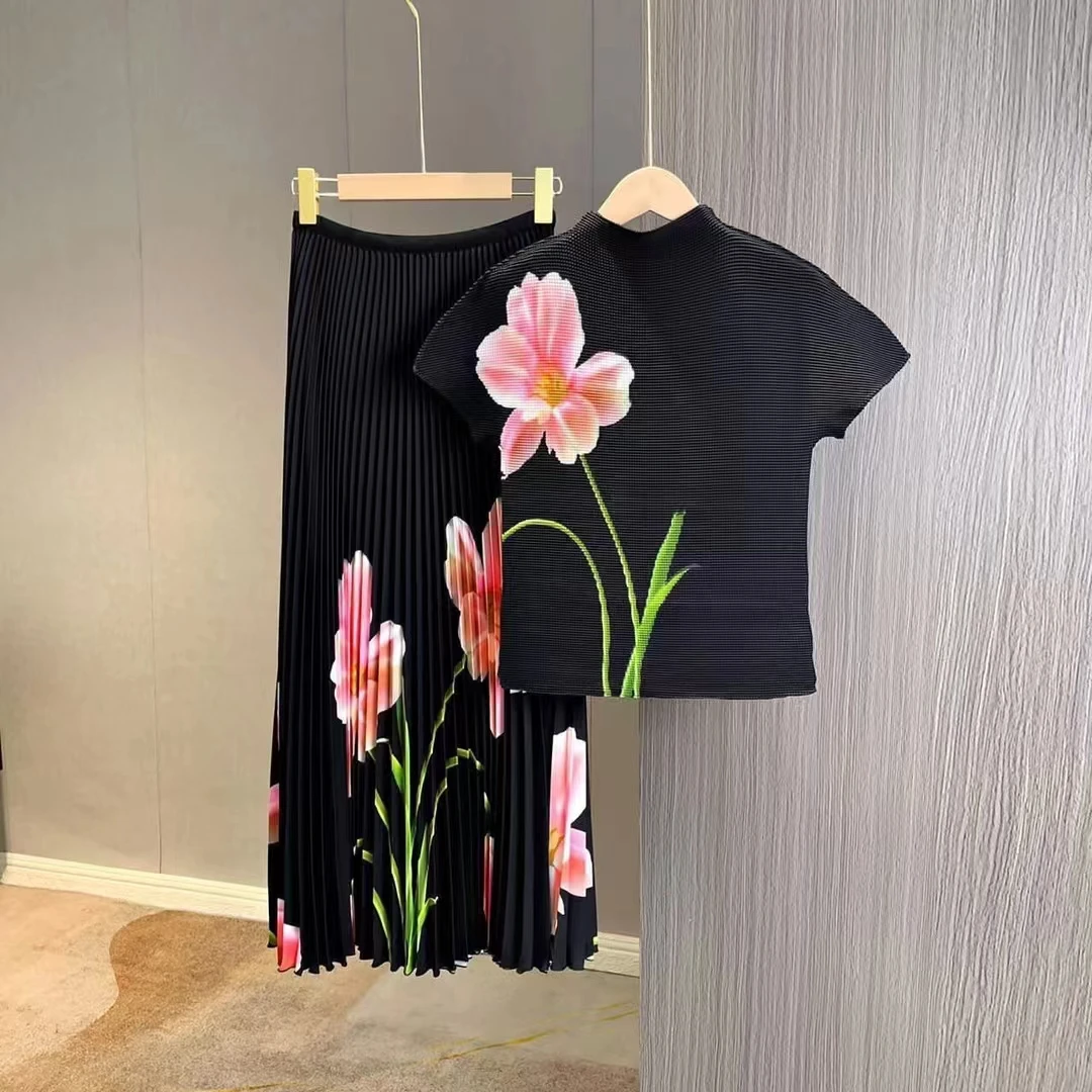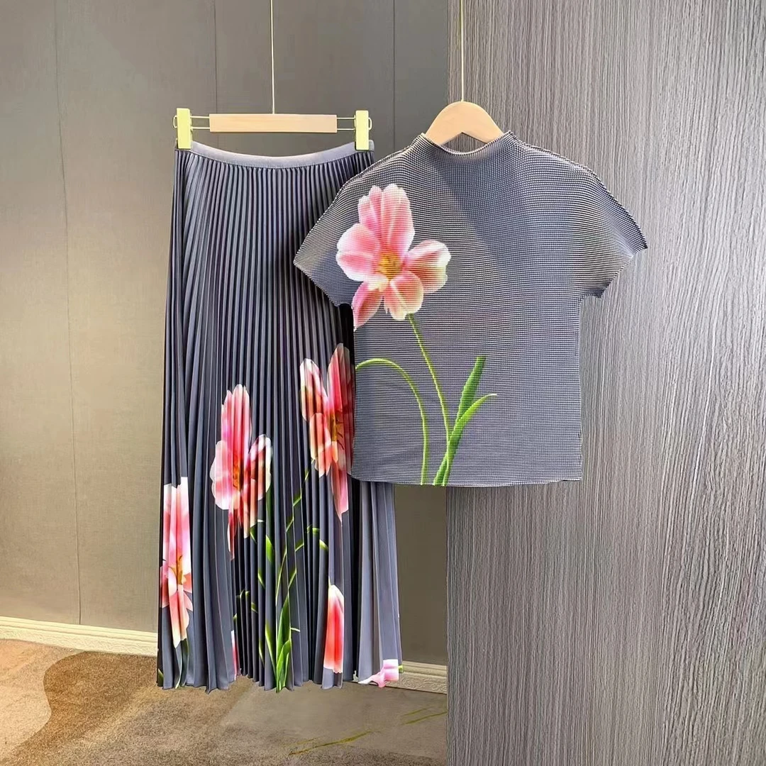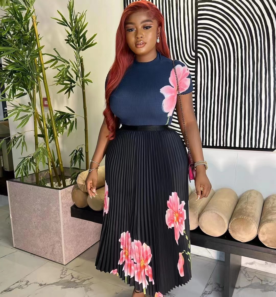 Stretchable African Floral Print Miyake Pleated Plus Size Women Clothing Two Piece Set Top and Skirt