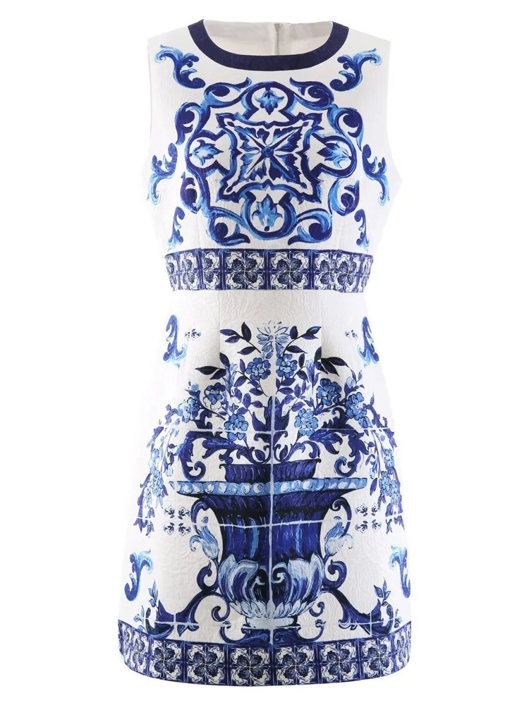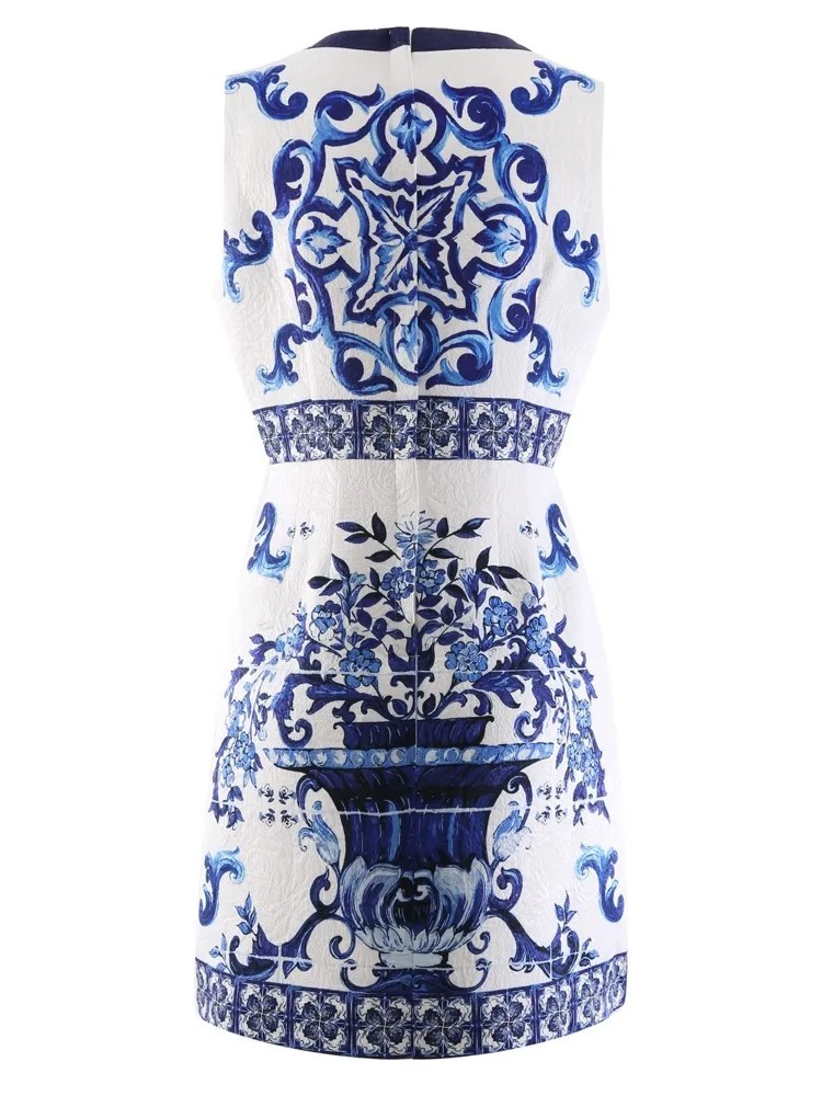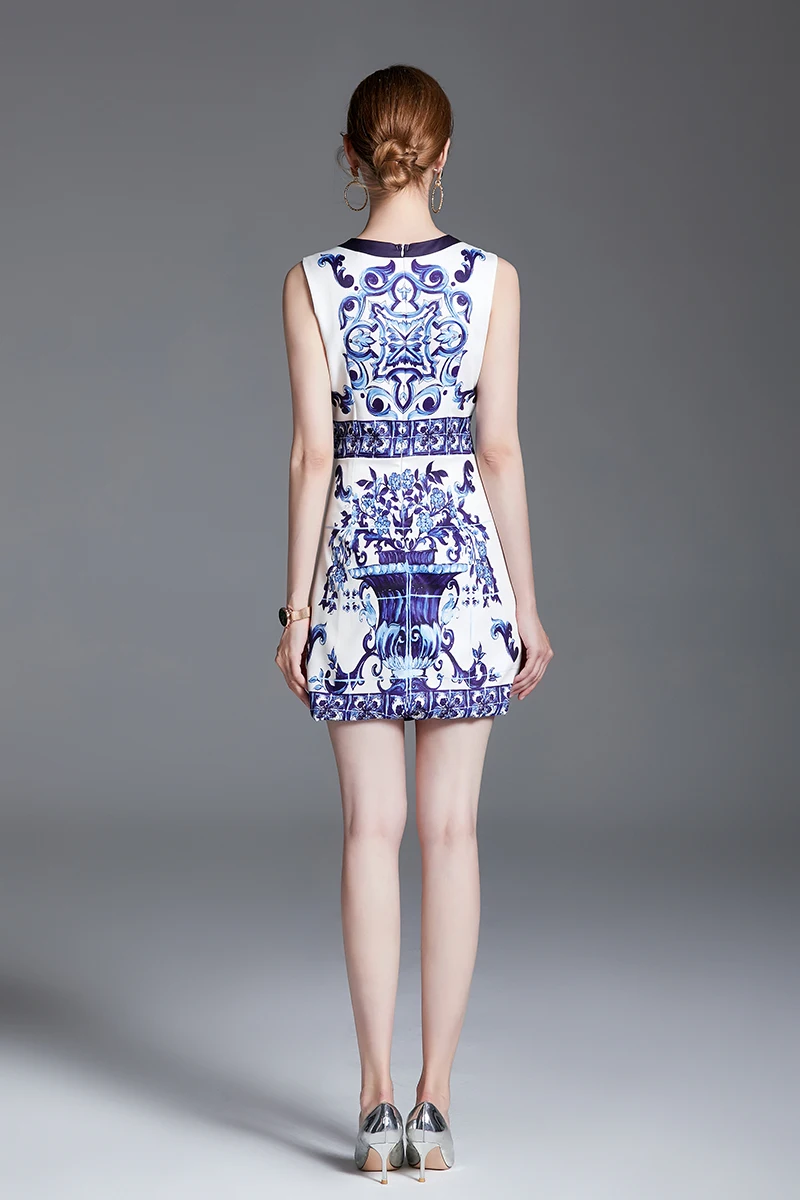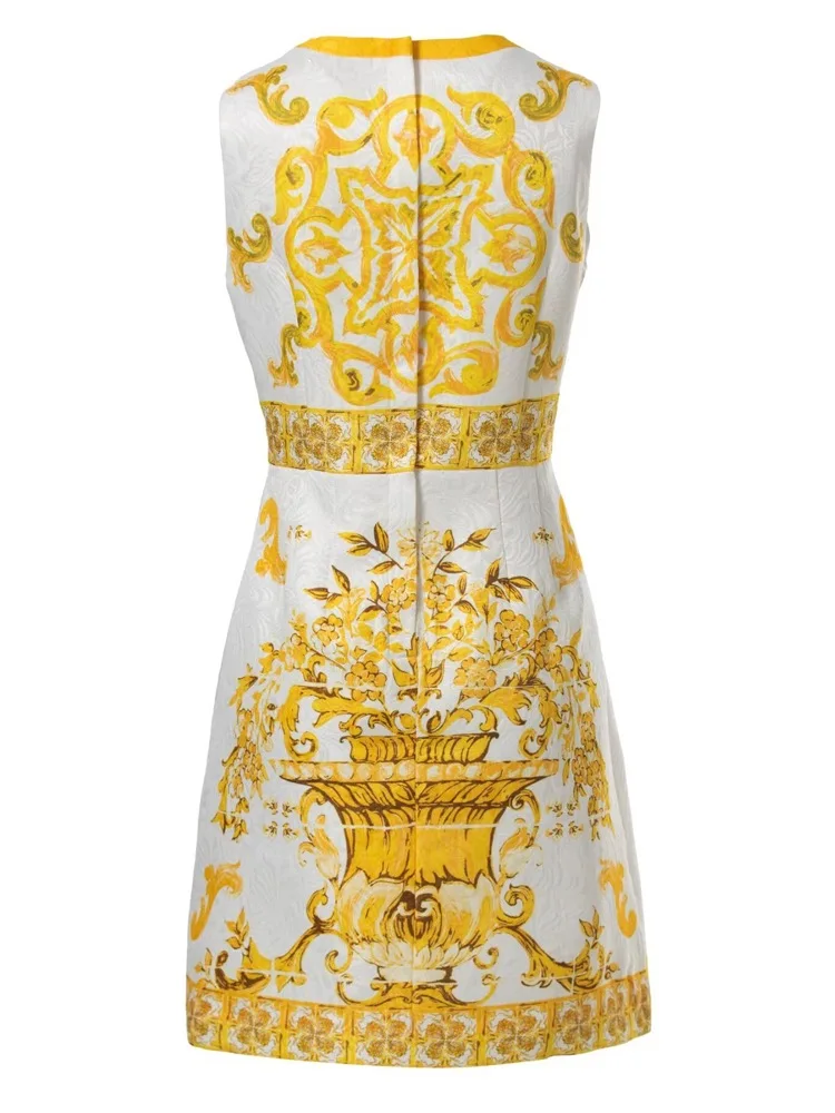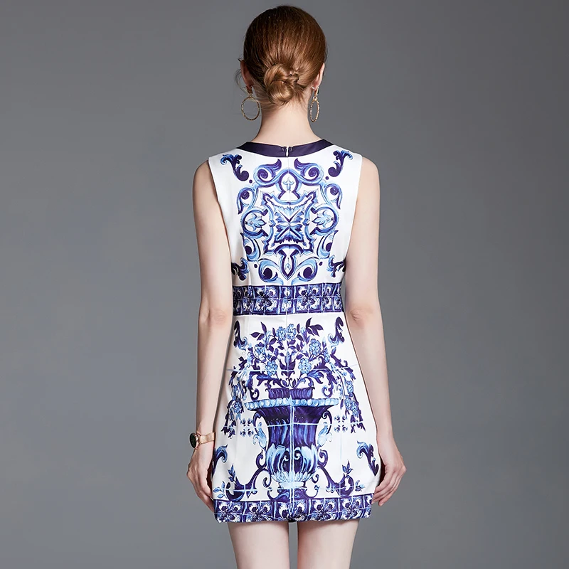 Summer Golden Sundress Holiday Floral Short Dress Women's Yellow Blue And White Porcelain Print Holiday Tank Mini Vestidos